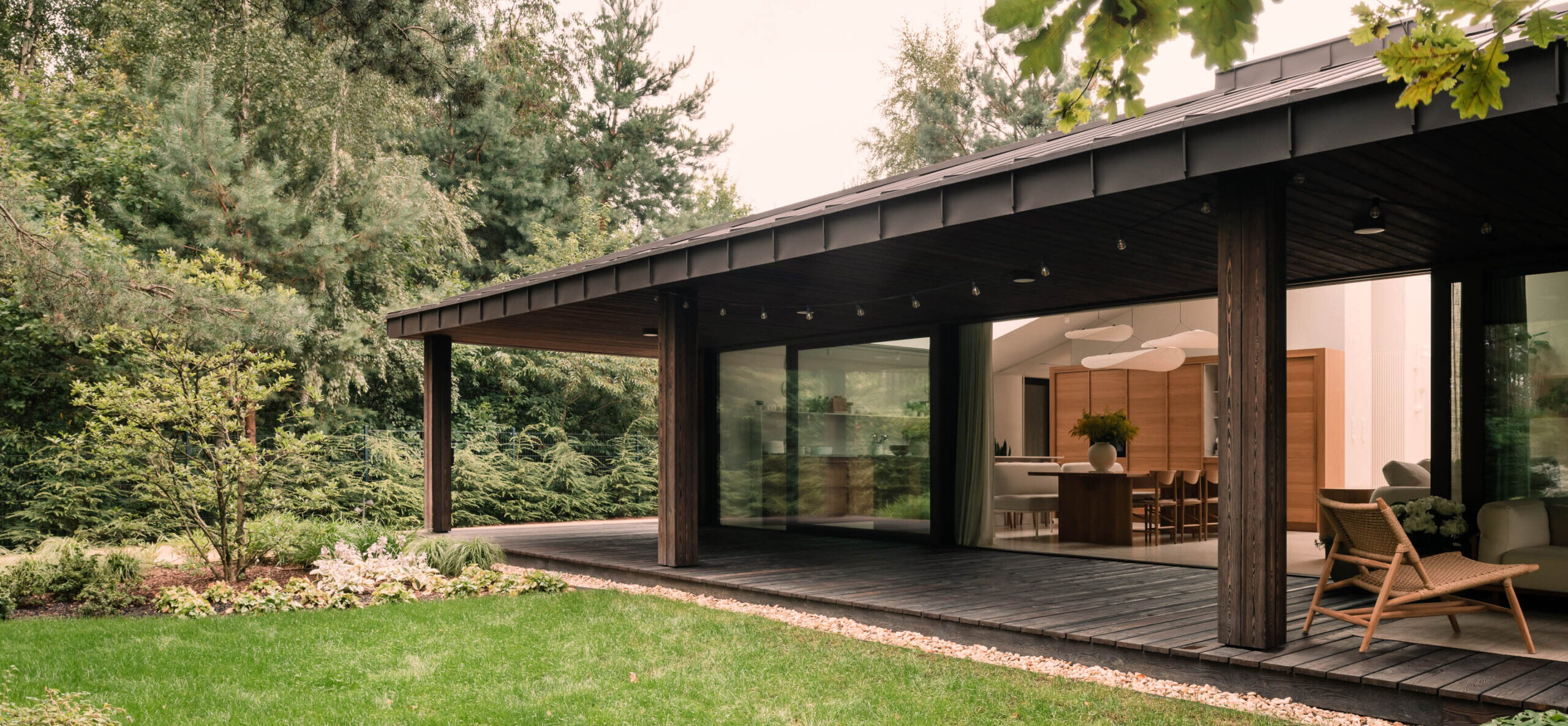 The terrace in the fired version can be an extension of the fired façade or, on the contrary, a contrasting element. Selecting the right type of wood (e.g. larch) and occasional, periodic impregnation of the boards will ensure that the terrace made of fired wood will serve and please the eye for years.